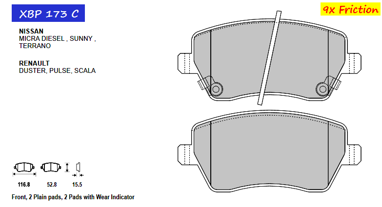 NISSAN MICRA DIESEL , SUNNY , TERRANO RENAULT DUSTER, PULSE, SCALA Front, 2 Plain pads, 2 Pads with Wear Indicator